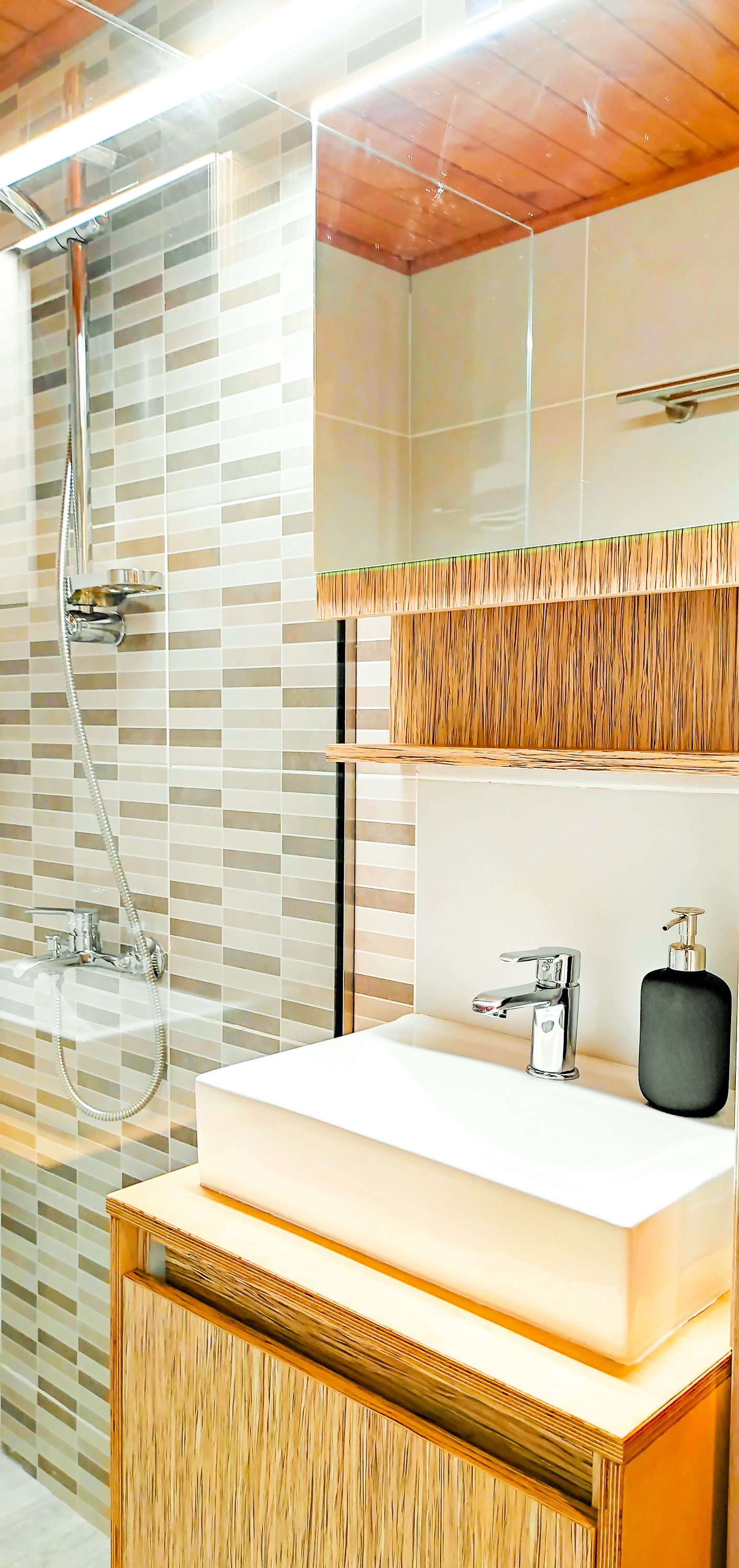 With hot water & Towels (housekeeping once a week). Shampoo, hair conditioner and shower gel provided