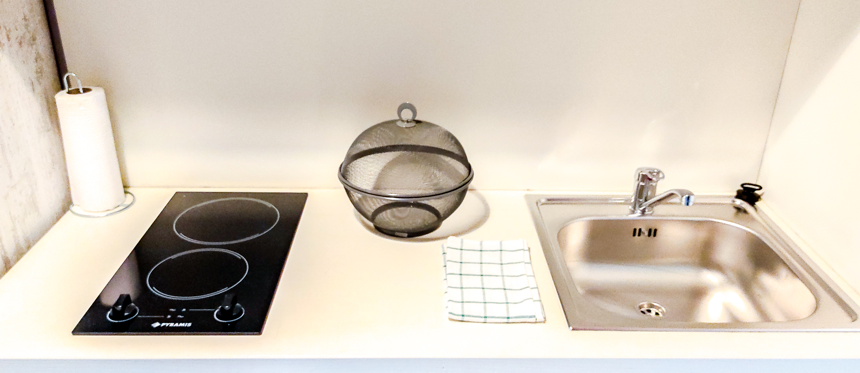 Small kitchen with sink, electric stove eyes, closets with basic kitchenware and small fridge